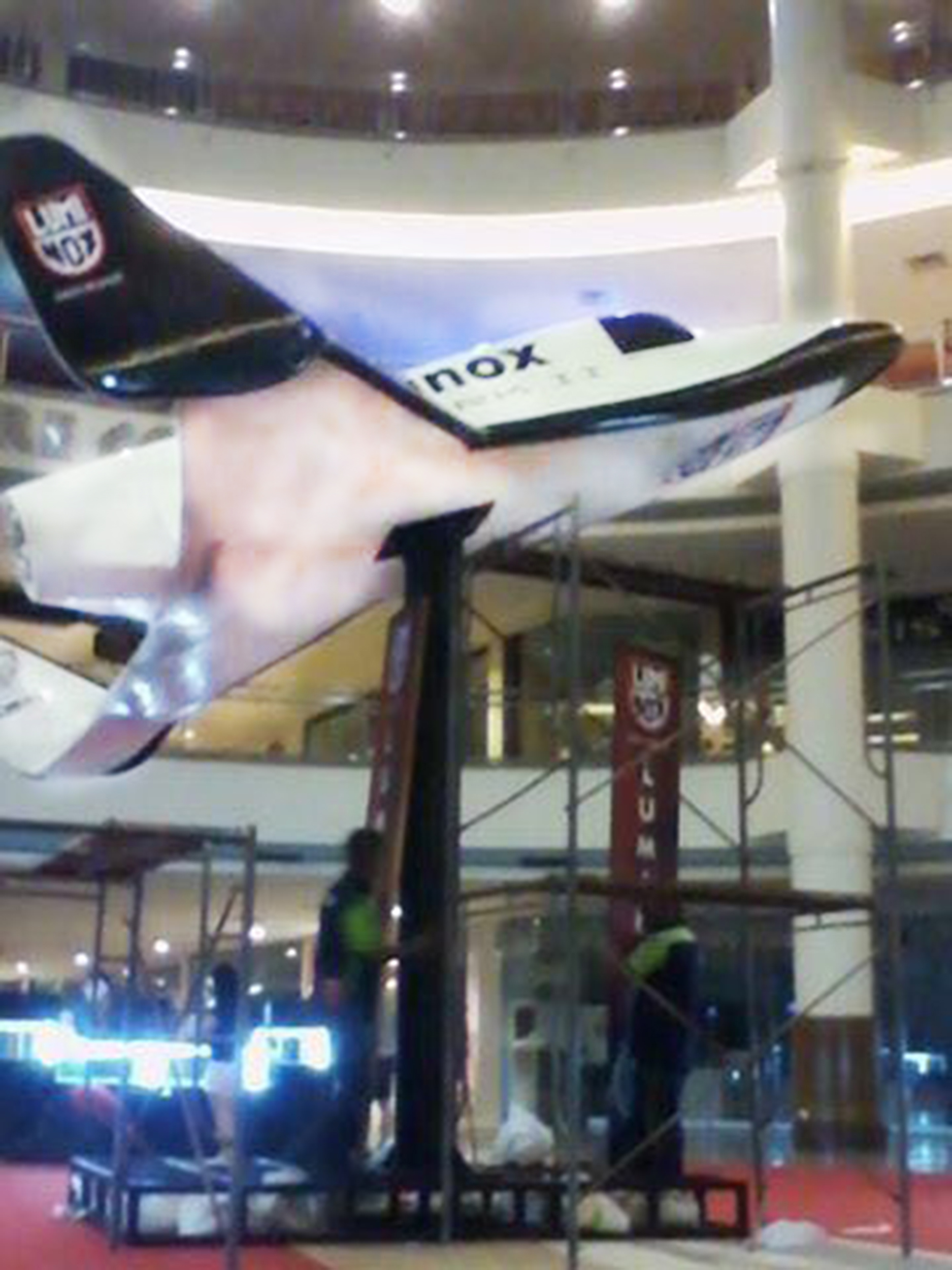| Requirement: | To assemble the space shuttle, hoist it & to attach on a stand that is 14f high with a tilted plate with a 1f by 1f dimension After the event, to bring down the space shuttle & export to Brunei |